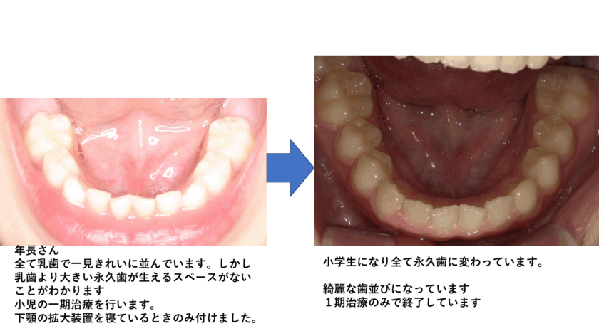 スペースを作ってあげることで生えてくる歯も曲がって生える可能性がぐんと減りますので2期治療に移行した場合であっても早く終わることが多いいです。